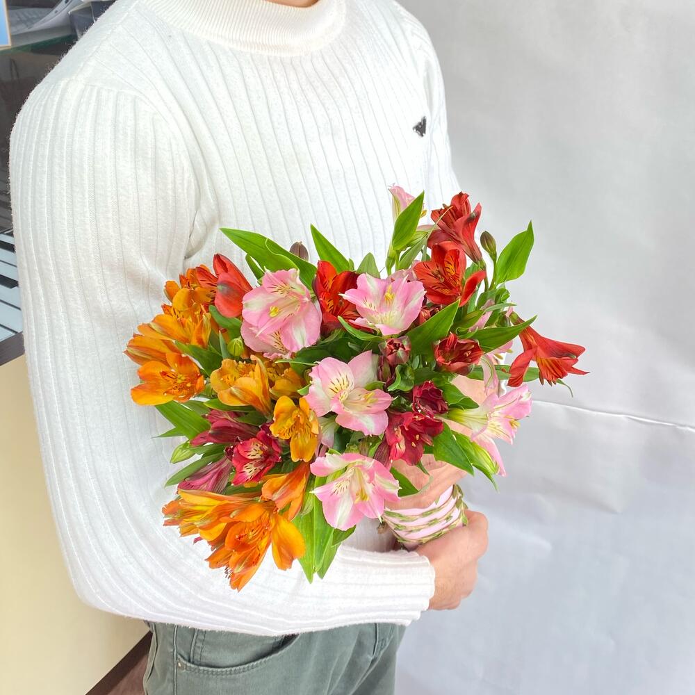 альстромерия микс – 11 шт.Фоамиран – 1 шт.Шпагат – 1 шт.рекомендация по уходу за цветами – 1 шт.вафельная трубочка подарок – 1 шт.