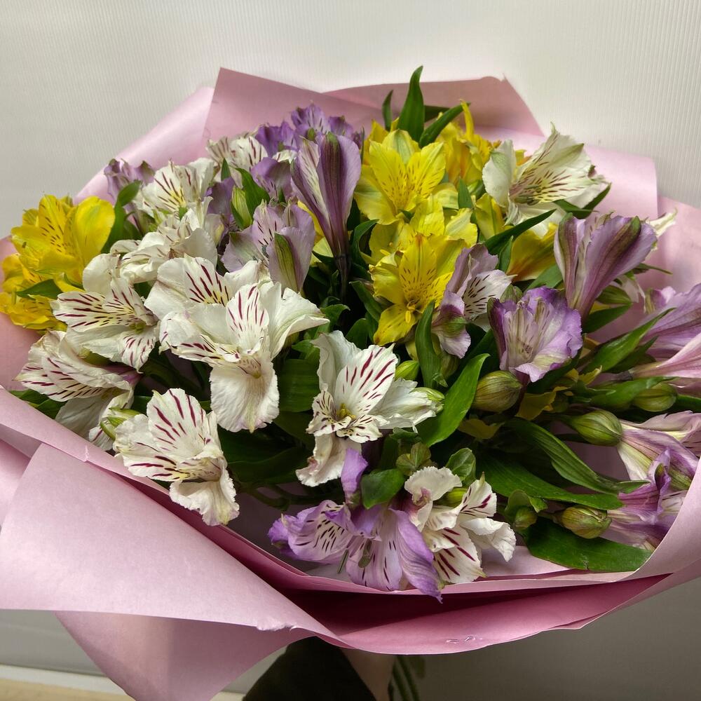 Альстромерия – 13 шт.Упаковка дизайнерская – 1 шт.Лента – 1 шт.