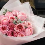 Букет из 15 розовых пионовидных роз с эвкалиптом
