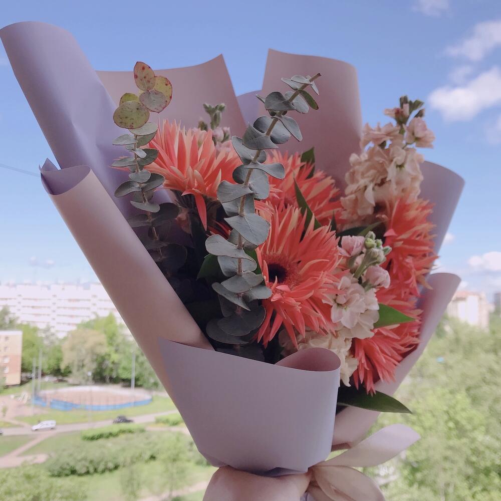 Махровые герберы, маттиола, эвкалипт