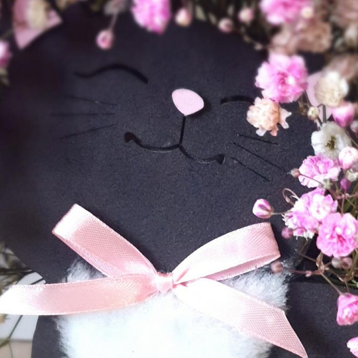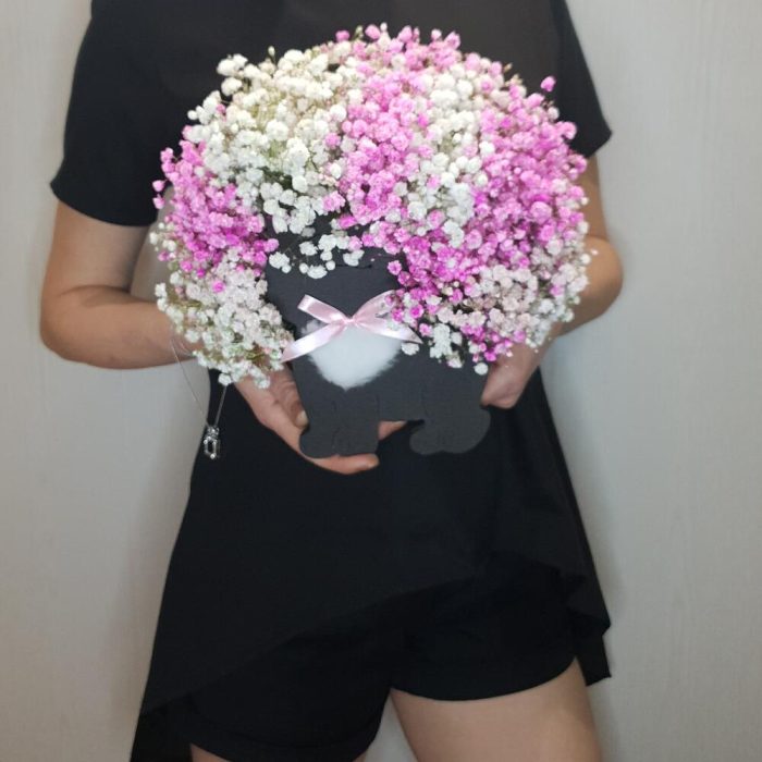 Открыточка с вашими пожеланиями – 1 шт.Оазис флористический – 1 шт.гипсофила радужная – 9 шт.любовь флориста (бесплатно) – 1 шт.кашпо котик деревянное – 1 шт.
