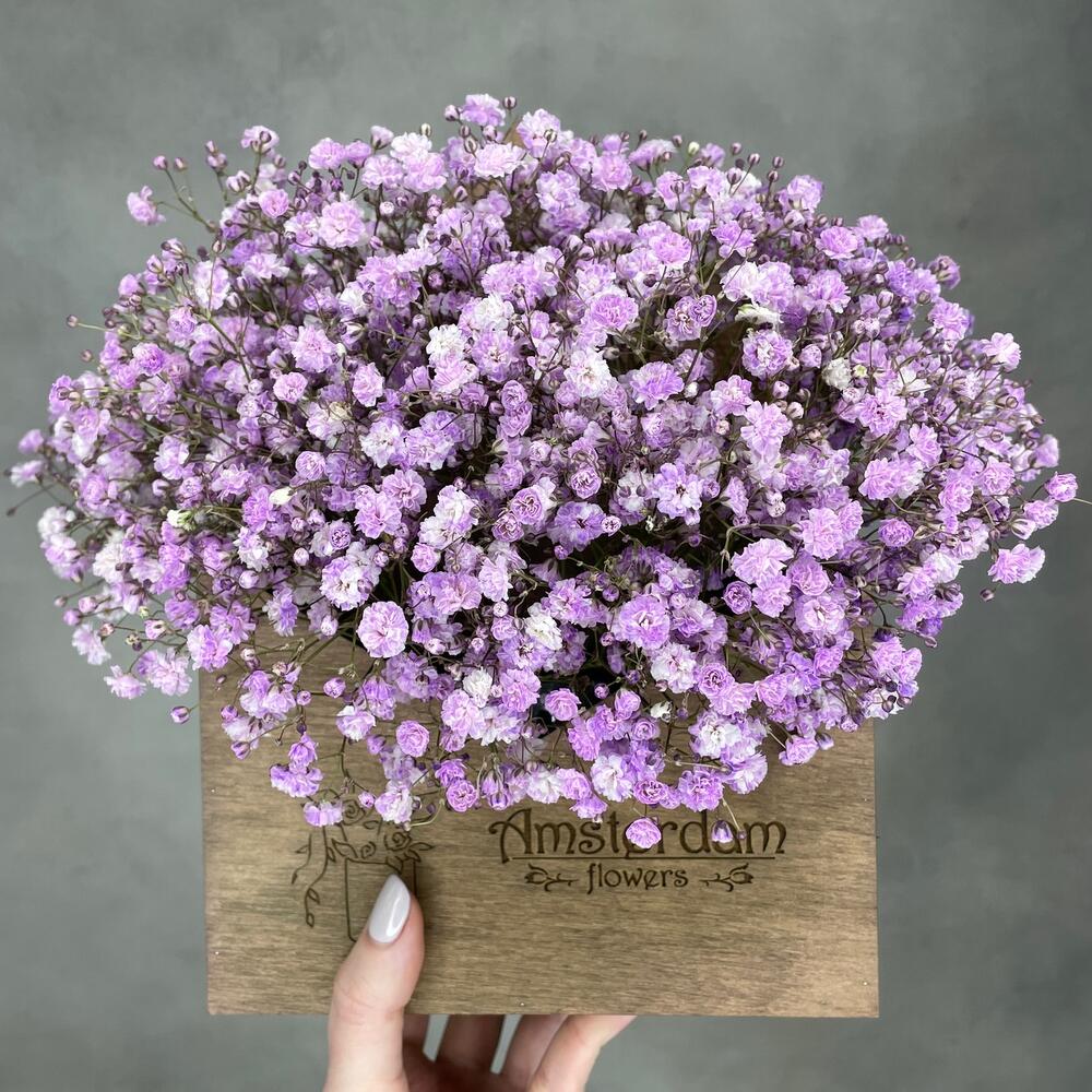 Гипсофила – 5 шт.Ящик деревянный – 1 шт.Оазис флористический – 1 шт.