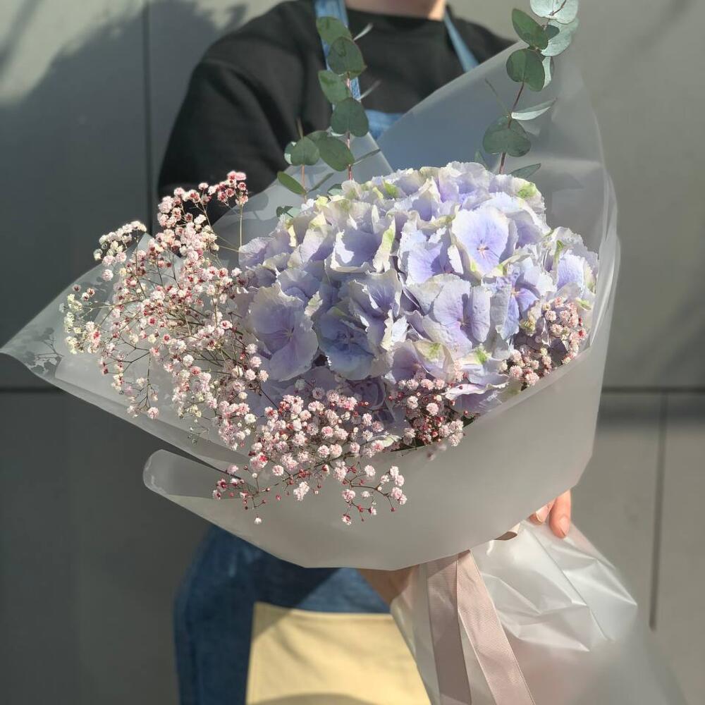 Гортензия – 1 шт.гипсофила цветная – 1 шт.Эвкалипт – 1 шт.Подарочная упаковка – 1 шт.средство для продления жизни срезанных цветов – 1 шт.