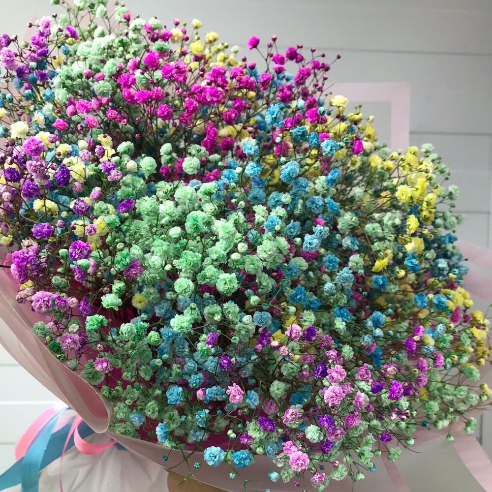 гипсофила радужная – 11 шт.Упаковка дизайнерская – 2 шт.Лента атласная – 1 шт.