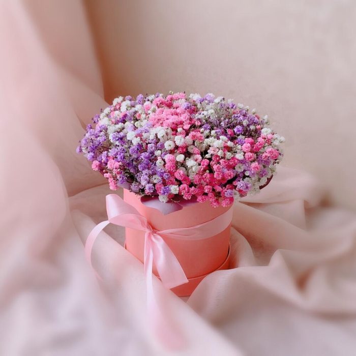 Шляпная коробка с лентой – 1 шт.Флористическая губка – 1 шт.радужная гипсофила – 5 шт.