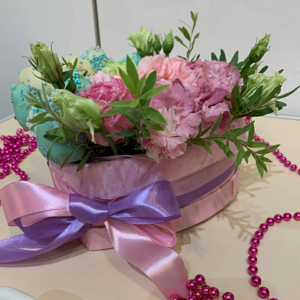 Лизиантус – 1 шт.Гвоздика сортовая – 3 шт.Коробка сердце – 1 шт.Фисташка пучок – 1 шт.Клубника в шоколаде – 11 шт.Дизайнерская упаковка – 1 шт.