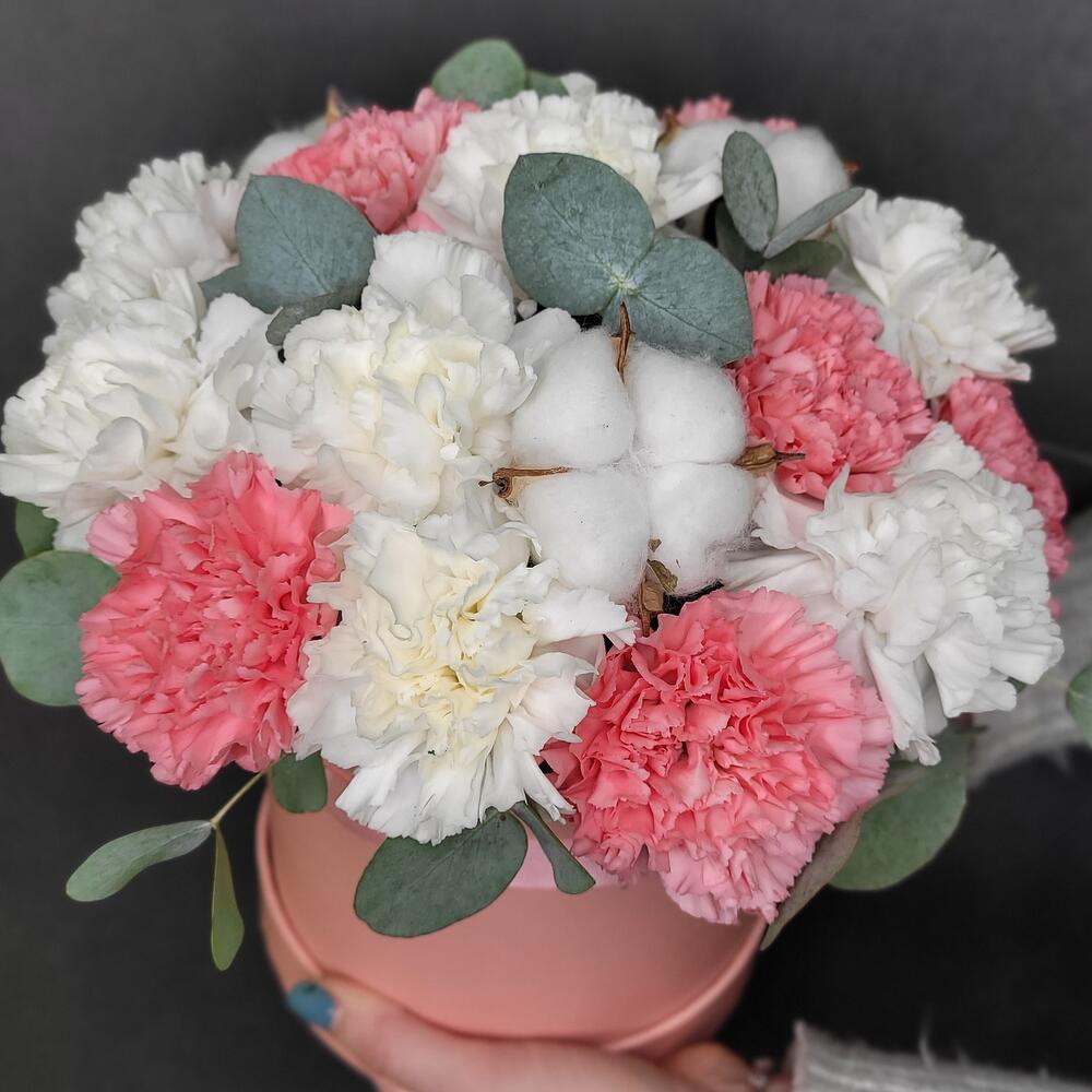 Хлопок – 3 шт.Эвкалипт – 7 шт.Диантус – 17 шт.Шляпная коробка – 1 шт.Оазис флористический – 1 шт.