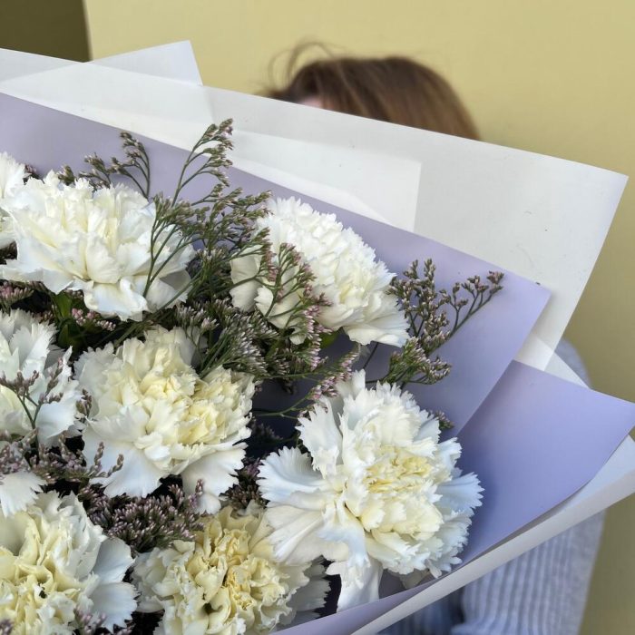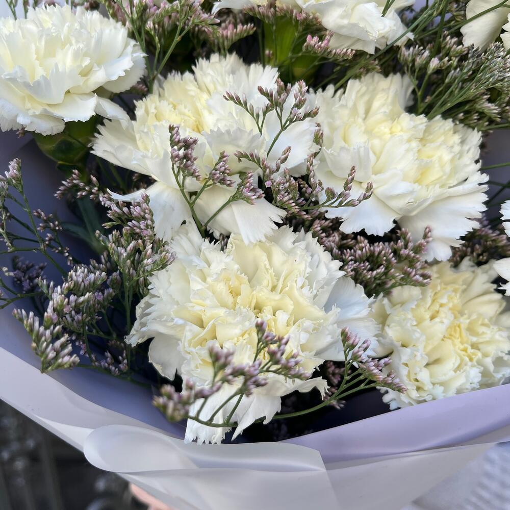 Лимониум – 2 шт.Лента атласная – 1 шт.Диантус белый – 9 шт.Упаковка корейская пленка – 2 шт.