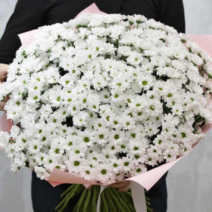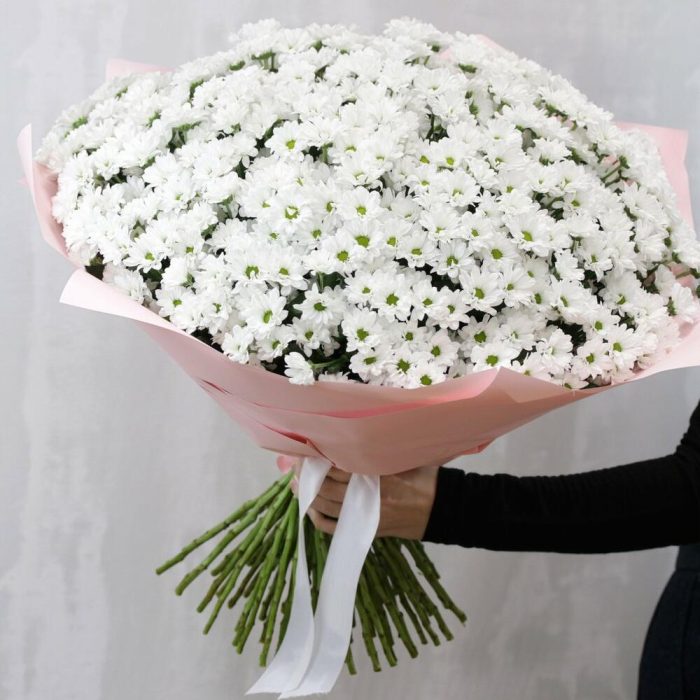 Букет из 75 белых кустовых хризантем Сантини в стильной упаковке