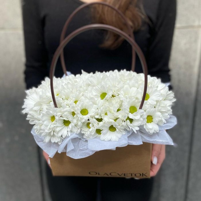 Хризантема кустовая – 5 шт.Тишью – 4 шт.Сумочка крафт – 1 шт.Оазис флористический – 1 шт.Кризал (подкормка) – 1 шт.инструкция по уходу за цветами – 1 шт.
