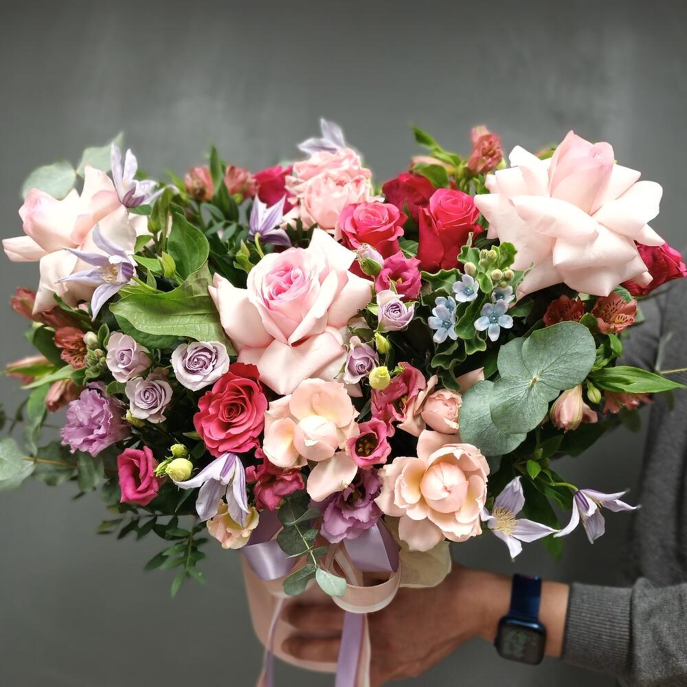 Коробка шляпная – 1 шт.оазис флористический кирпич – 1 шт.Калька упаковка – 1 шт.Лента атласная – 3 шт.роза пинк охара(ароматная) – 3 шт.Фисташка – 5 шт.Эвкалипт – 5 шт.Клематис – 4 шт.Оксипеталум – 3 шт.Альстромерия – 6 шт.Роза кустовая – 4 шт.Роза пионовидная кустовая – 3 шт.Роза – 7 шт.Лизиантус – 3 шт.
