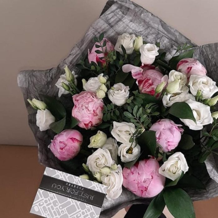 Пион Сара Бернар – 7 шт.эустома белая – 7 шт.Писташ – 5 шт.