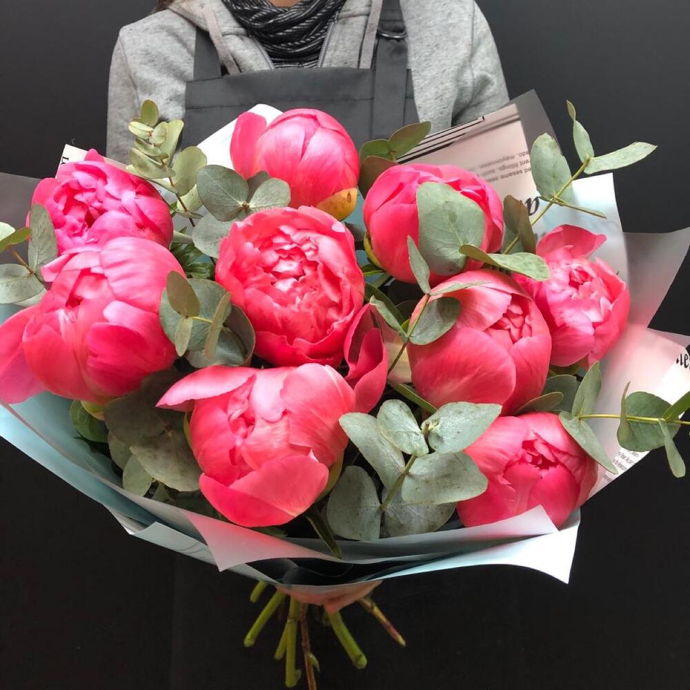 Пион – 9 шт.Эвкалипт – 5 шт.Упаковка дизайнерская – 1 шт.