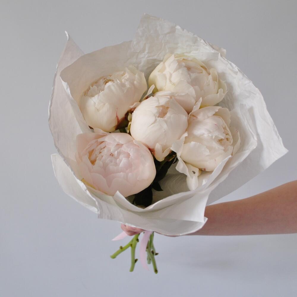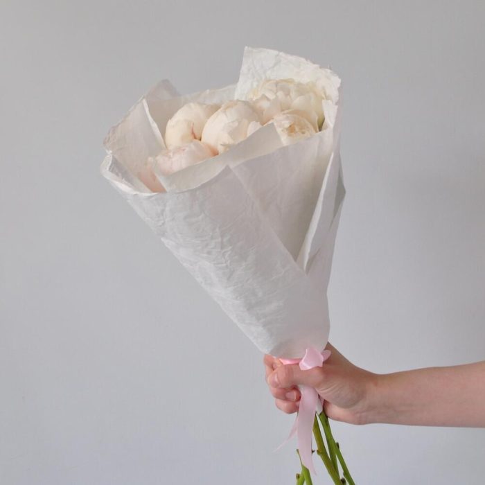 Лента атласная – 1 шт.Крафт – 2 шт.Пион белый – 5 шт.