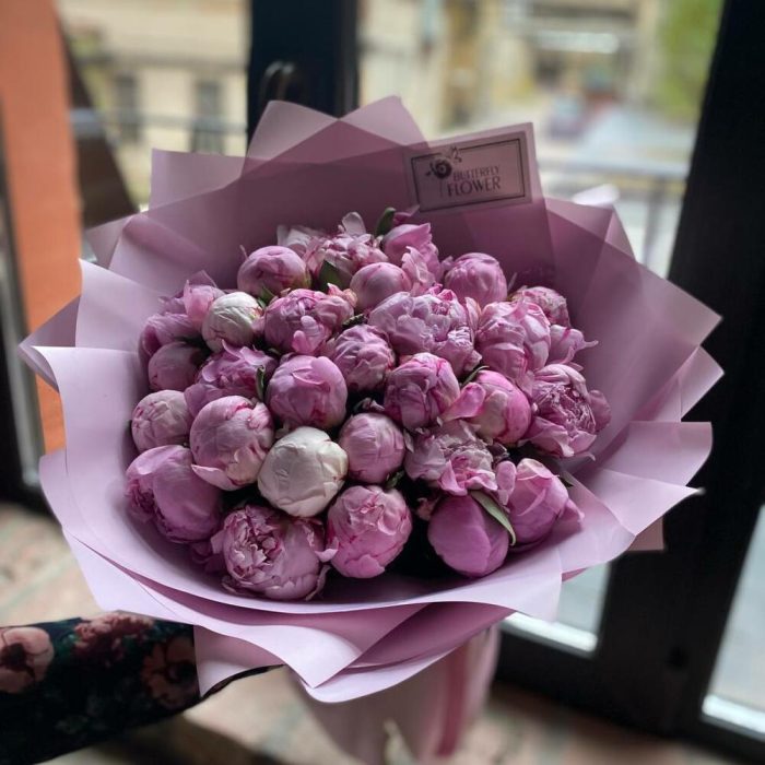 Букет из 29 розовых пионов в дизайнерской упаковке “Рэн Ортанс”