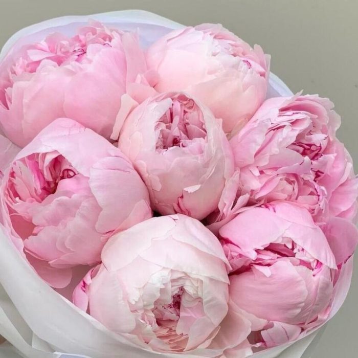 Пион розовый – 7 шт.Упаковка дизайнерская – 1 шт.Лента атласная – 2 шт.Открыточка с вашими пожеланиями – 1 шт.инструкция по уходу за цветами – 1 шт.хорошее настроение – 100 шт.коробка переноска – 1 шт.Кризал – 1 шт.