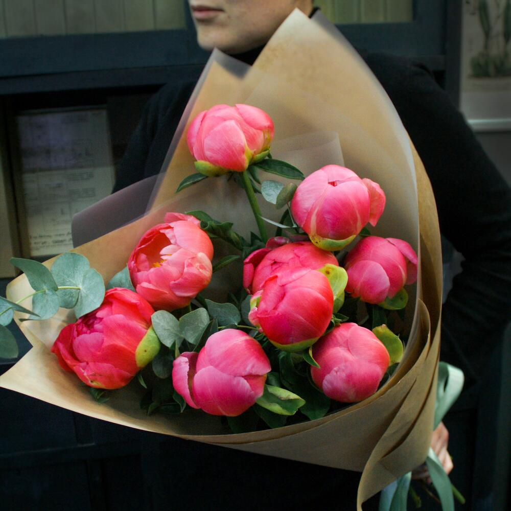 Пион Коралл Шарм (Coral Charm) – 9 шт.Эвкалипт – 3 шт.Дизайнерская упаковка – 1 шт.