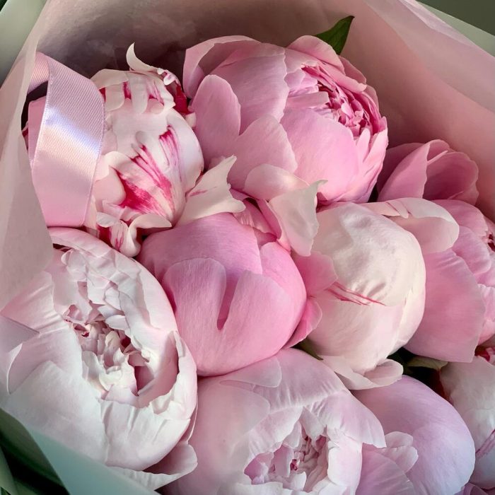 Лента атласная – 4 шт.Пион Сара Бернар – 9 шт.Упаковка дизайнерская – 4 шт.Средство для продления жизни цветов – 2 шт.инструкция по уходу за цветами – 1 шт.