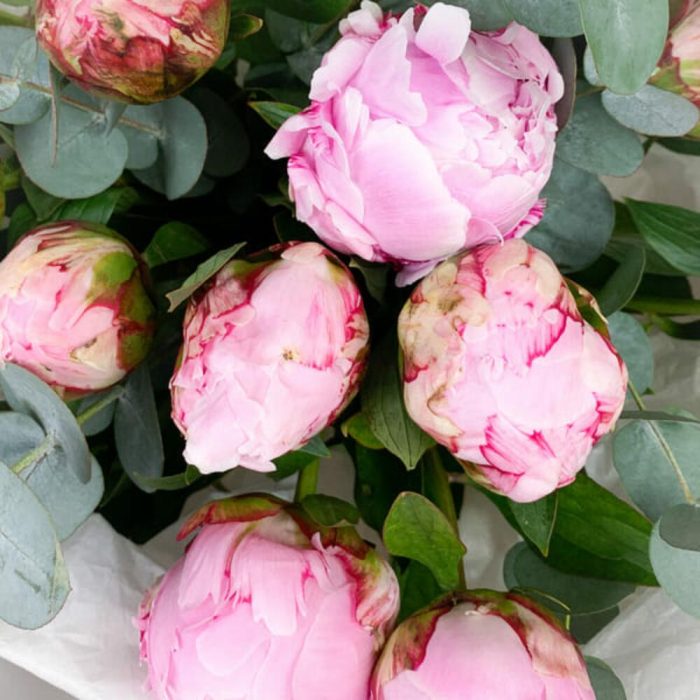 Букет из розовых пионов Premium 11 шт с эвкалиптом