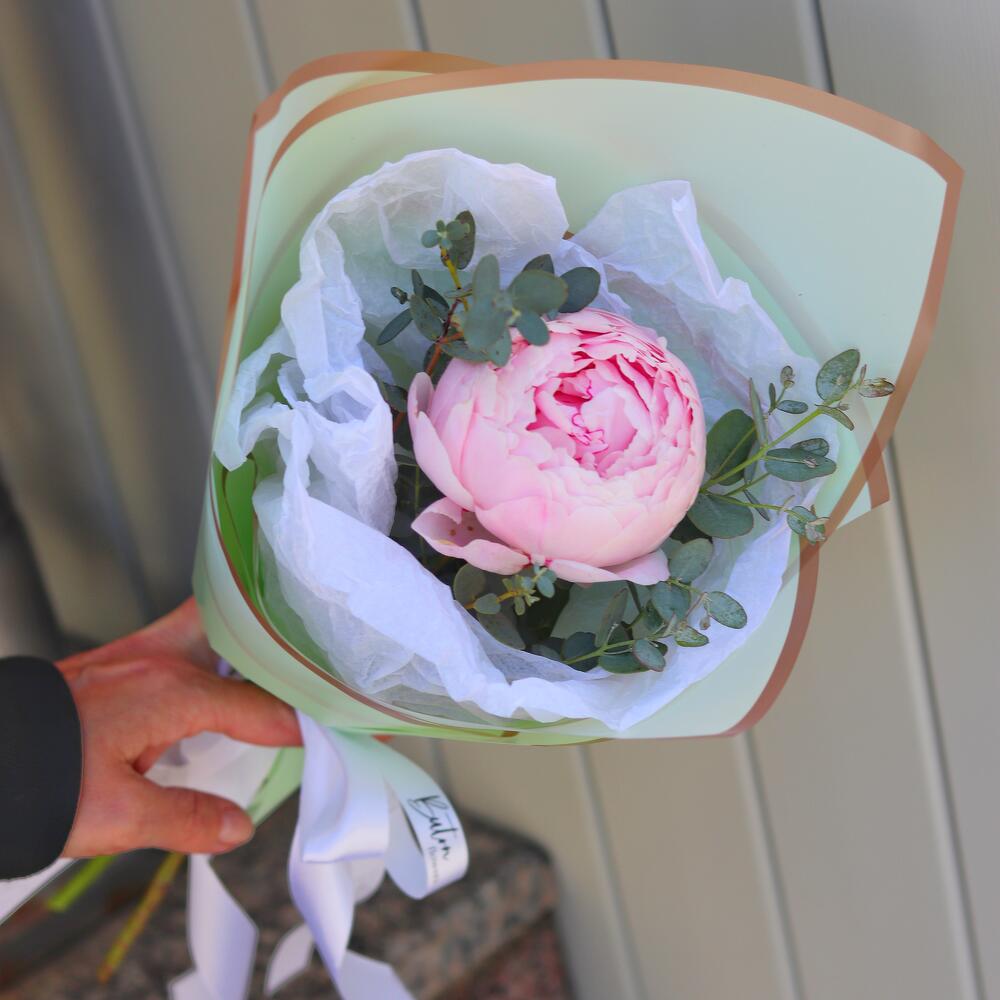Эвкалипт – 1 шт.Пион Сара Бернар – 1 шт.Открыточка с вашими пожеланиями – 1 шт.Шоколадка – 1 шт.Дизайнерская упаковка – 1 шт.