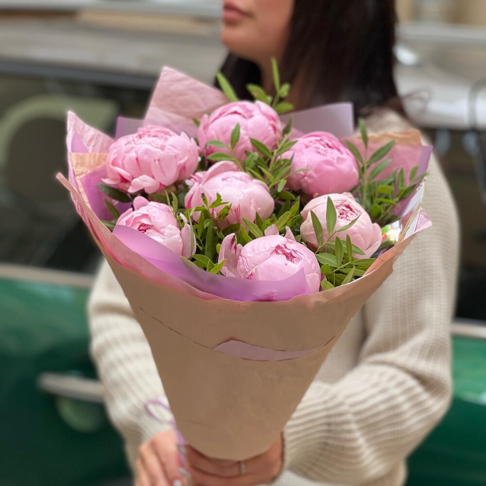 Упаковка – 2 шт.Лента атласная – 2 шт.Фисташка – 3 шт.Пион Сара Бернар – 7 шт.