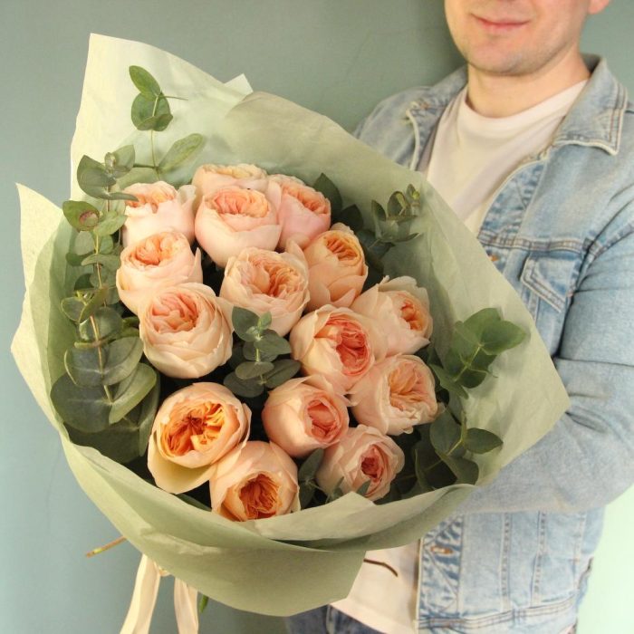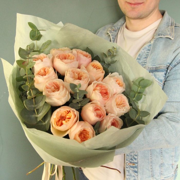Роза пионовидная – 15 шт.Эвкалипт – 5 шт.Тишью – 4 шт.Лента атласная – 2 шт.