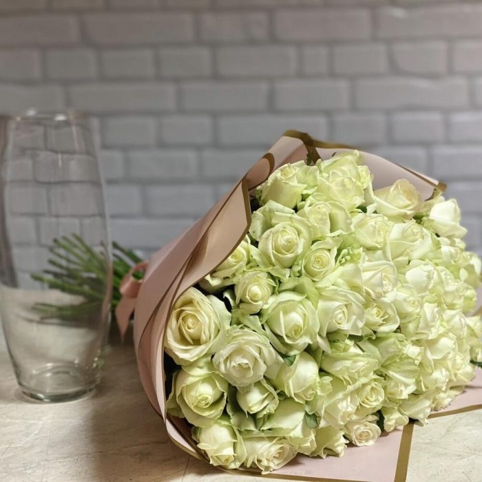 роза украинская белая – 51 шт. оформление калька – 1 шт. Стеклянная ваза – 1 шт.