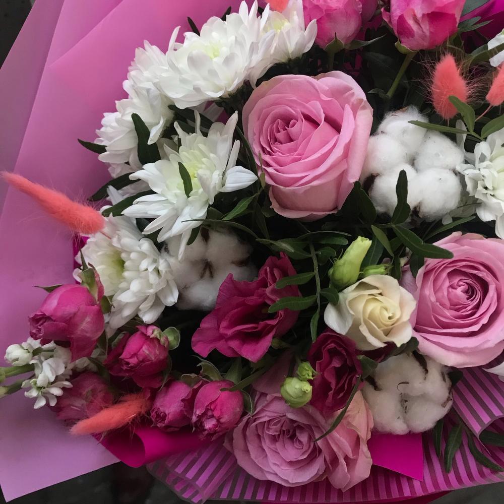 Роза – 3 шт.Роза кустовая – 2 шт.Хризантема кустовая – 3 шт.Эустома – 2 шт.Маттиола – 3 шт.Лагурус (сухоцвет) – 7 шт.Хлопок натуральный – 3 шт.зелень декоративная – 1 шт.Упаковка дизайнерская – 1 шт.Лента атласная – 1 шт.