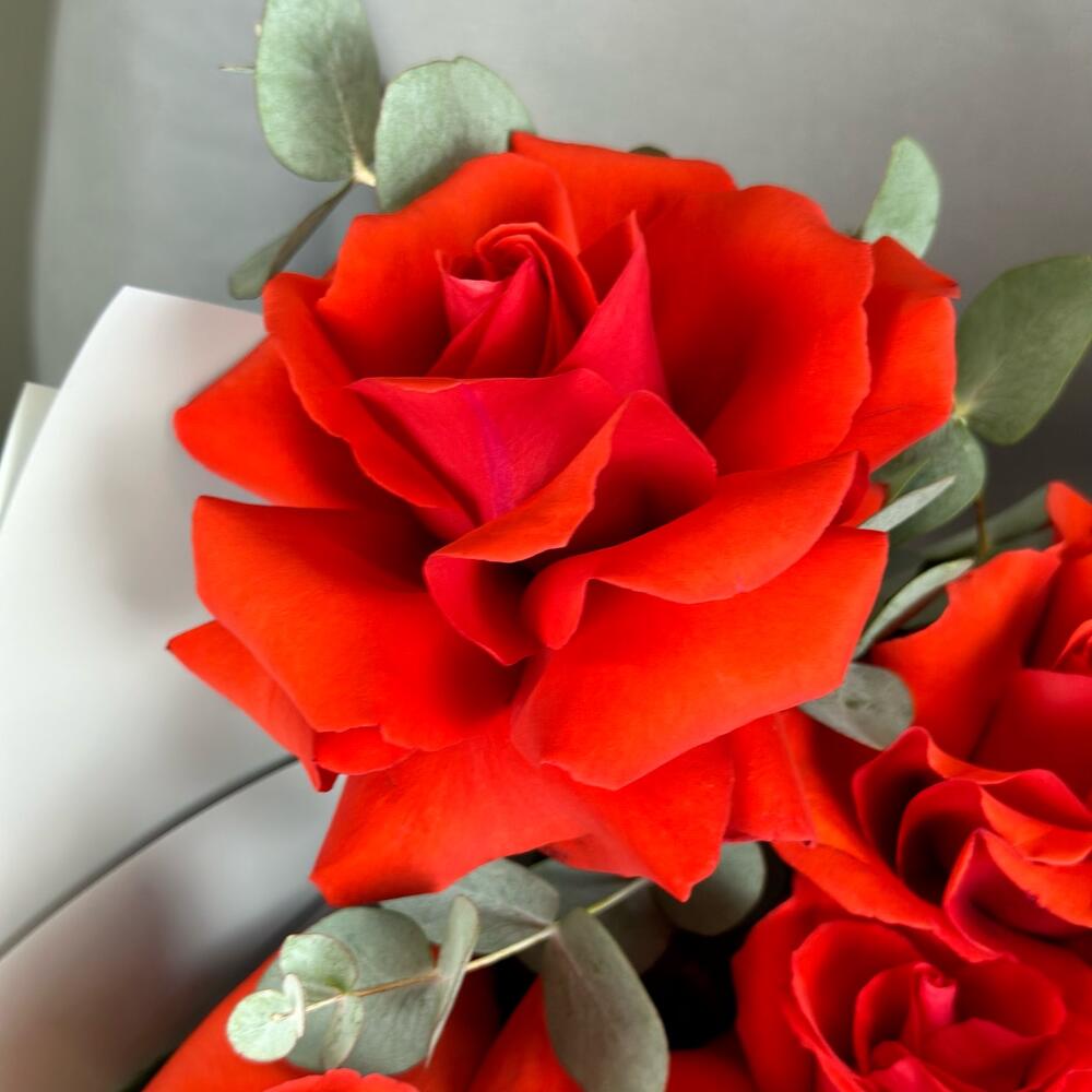 Эвкалипт – 1 шт.Лента атласная – 1 шт.Французская роза – 5 шт.Тишью белое – 1 шт.Дизайнерская упаковка – 1 шт.