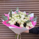 Букет из 15 белых пион роз кустовых с эвкалиптом (сб 015)