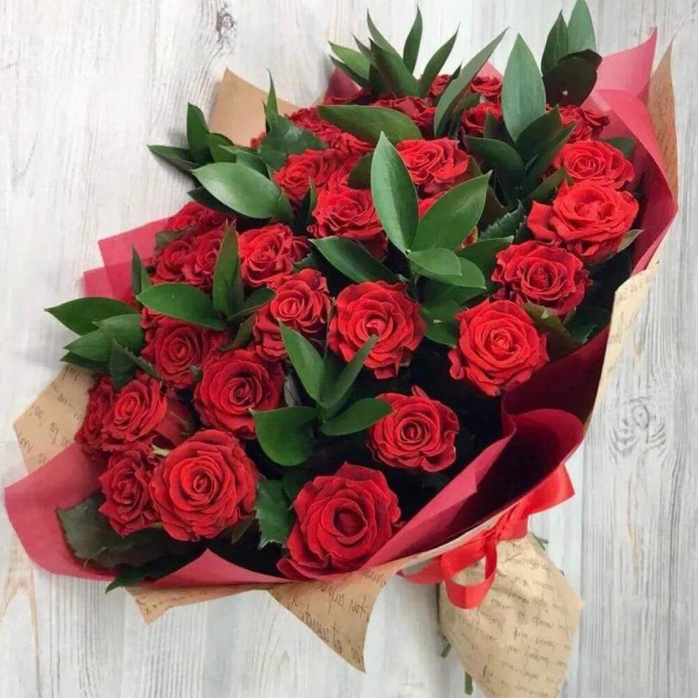 Рускус – 3 шт.Подарочная упаковка – 1 шт.розы 50 см – 25 шт.