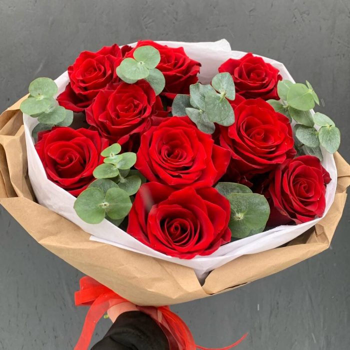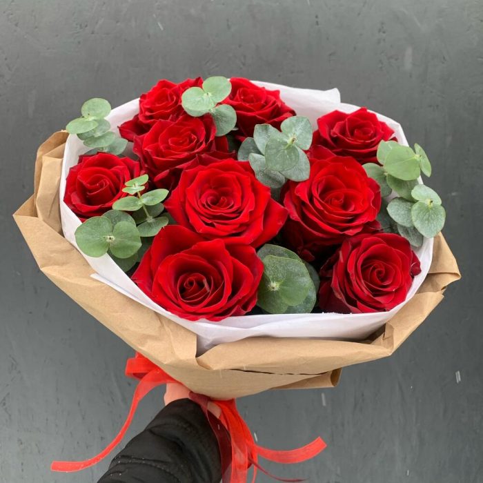 Роза – 9 шт.Эвкалипт – 2 шт.Упаковка дизайнерская – 3 шт.