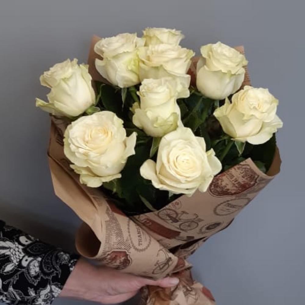 Роза – 9 шт.Крафт упаковка – 1 шт.Лента атласная – 1 шт.