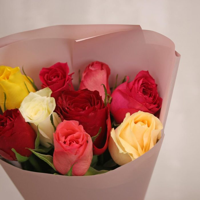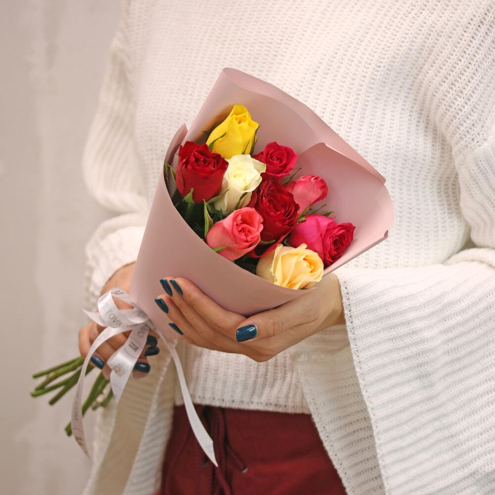 Букет из 9 роз мини яркий микс 35-40 см (Кения) в упаковке