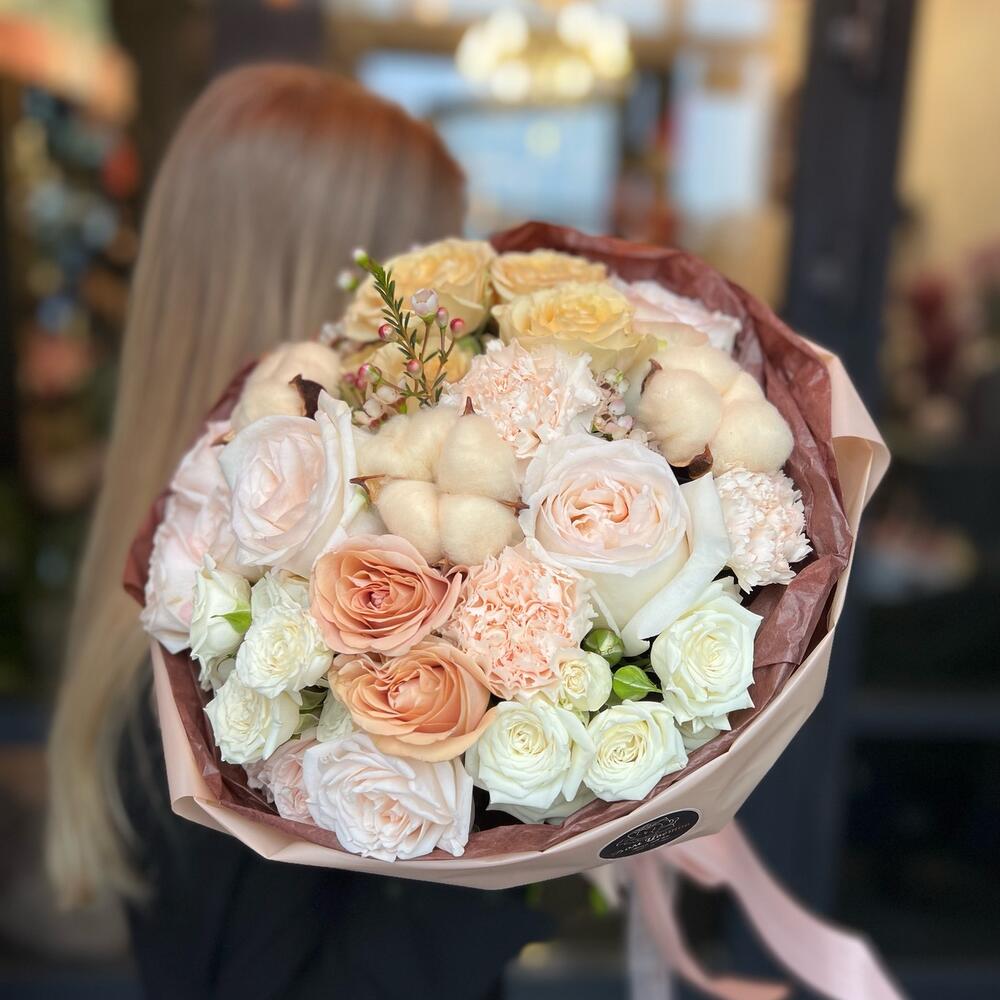 Букет из ароматных пионовидных роз и хлопка «Капуччино»