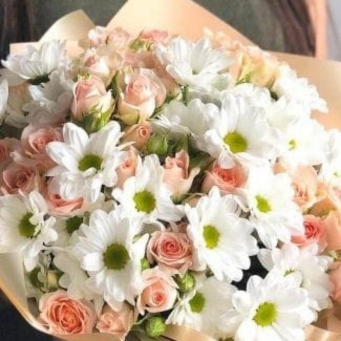 Хризантема кустовая – 6 шт.Роза кустовая – 7 шт.Упаковка дизайнерская – 2 шт.