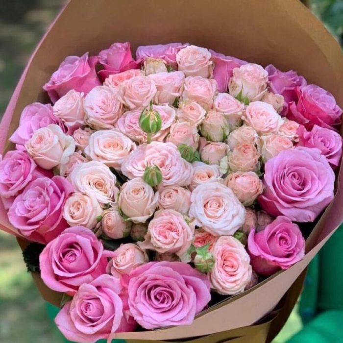 Одноголовая роза – 15 шт.Кустовая роза – 20 шт.Упаковка дизайнерская – 1 шт.Лента атласная – 2 шт.Открыточка с вашими пожеланиями – 1 шт.хорошее настроение – 100 шт.инструкция по уходу за цветами – 1 шт.коробка переноска – 1 шт.Кризал – 1 шт.