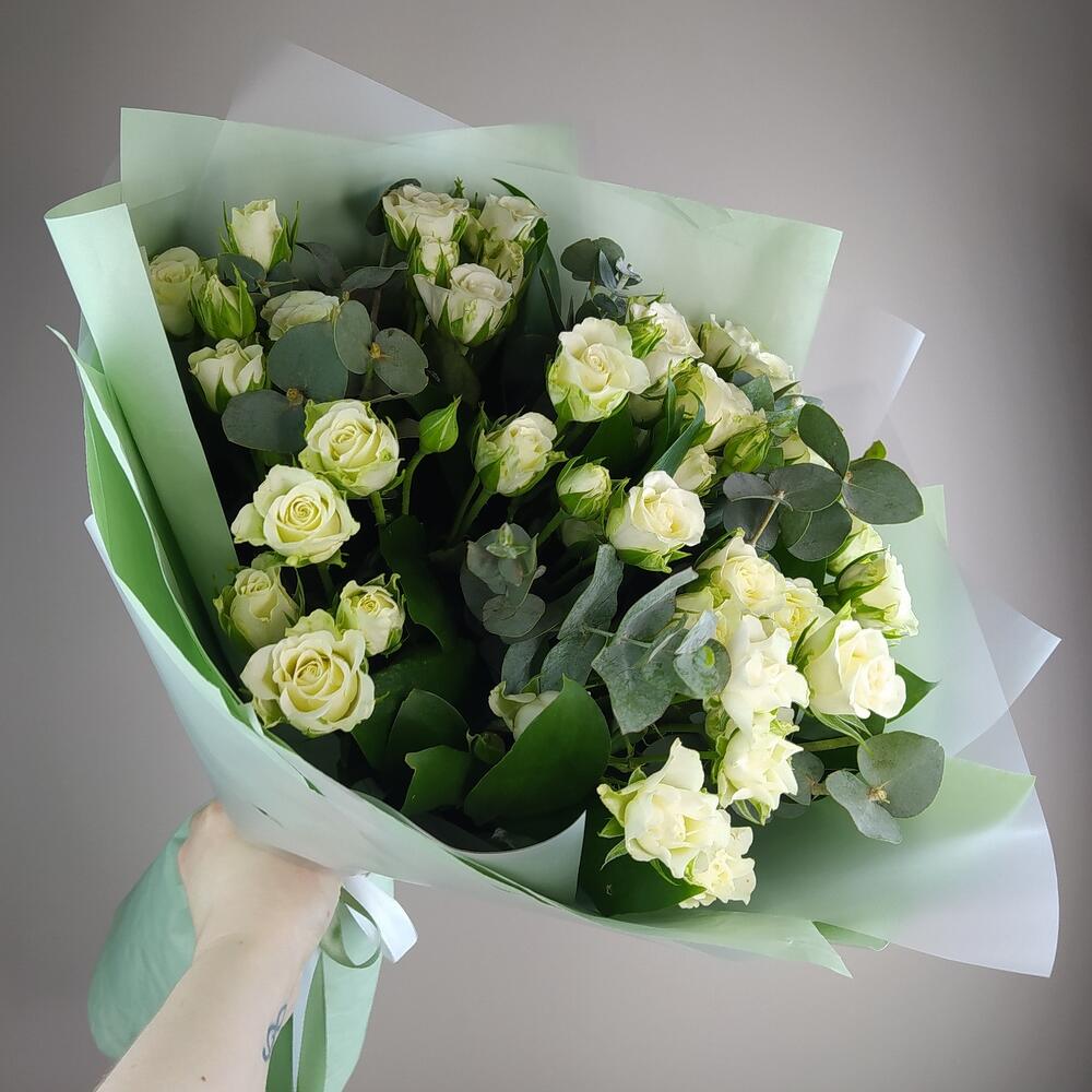 Роза кустовая – 11 шт.Эвкалипт – 5 шт.Зелень – 3 шт.Лента атласная – 2 шт.Упаковка дизайнерская – 2 шт.