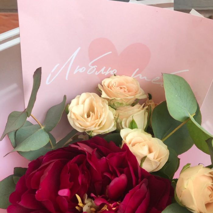 Пион – 1 шт.Роза кустовая – 2 шт.Эвкалипт – 2 шт.Упаковка дизайнерская – 3 шт.