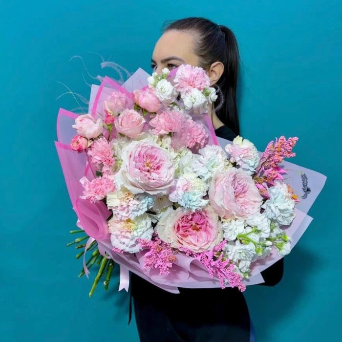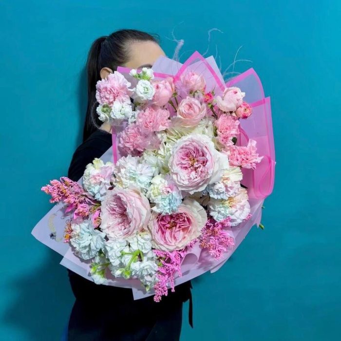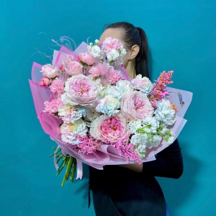 Букет нежный розовый из пионовидных роз и маттиолы