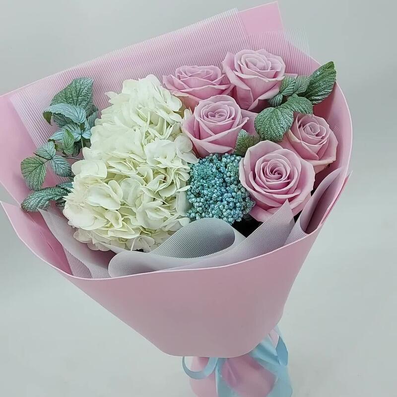Гортензия – 1 шт.Озотамнус – 1 шт.Роза Эквадор – 5 шт.Упаковка дизайнерская – 1 шт.рубус зелень – 5 шт.