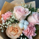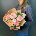 Стильный букет с розами, альстромерией, гвоздиками и хризантемой