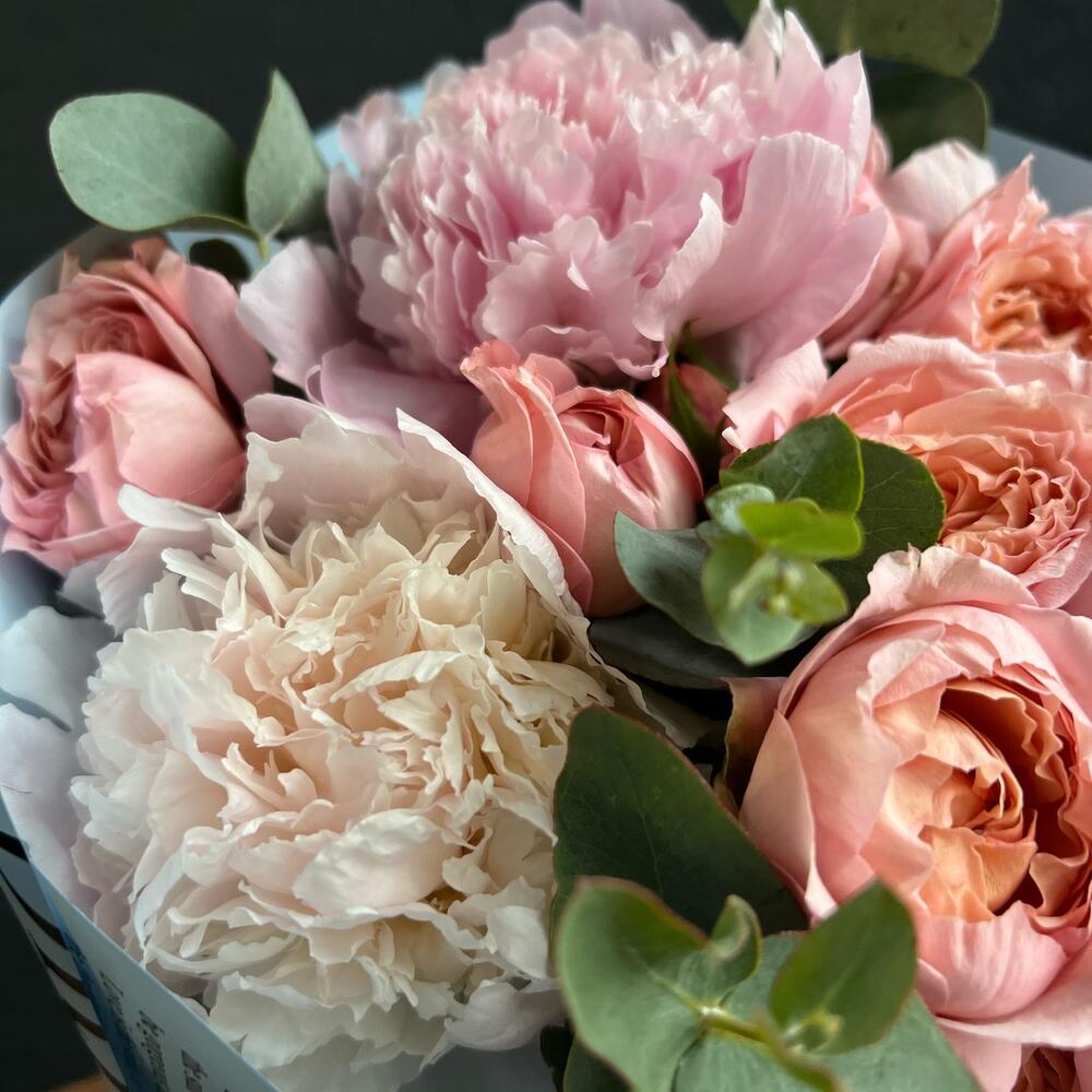 Эвкалипт – 5 шт.Атласная лента – 1 шт.Кустовая пионовидная роза – 2 шт.декоративная упаковка – 1 шт.пионы – 3 шт.