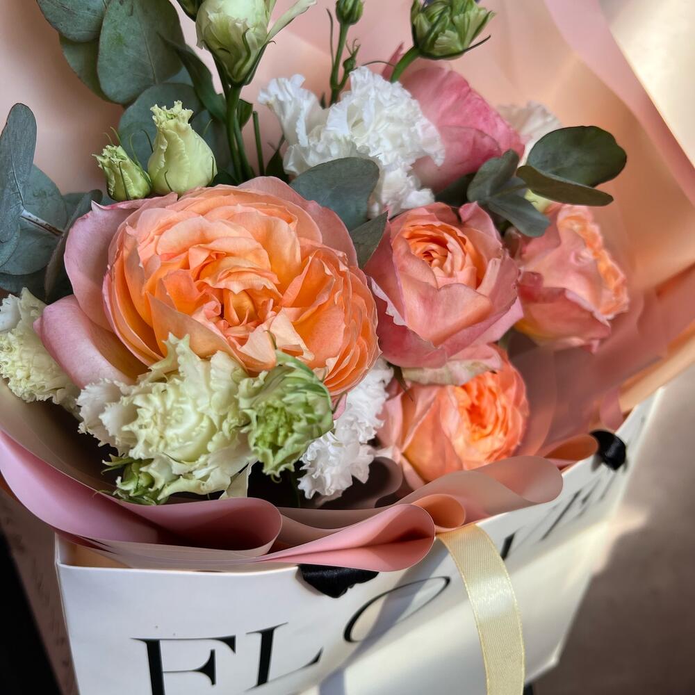 Пионовидная роза – 5 шт.Лизиантус (эустома) – 2 шт.Эвкалипт – 2 шт.Дизайнерская упаковка – 1 шт.Атласная лента – 1 шт.