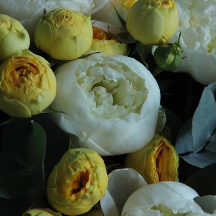 Пион белый – 5 шт.Пионовидная кустовая роза – 5 шт.Эвкалипт – 7 шт.Упаковка – 2 шт.Лента атласная – 2 шт.Открытка – 1 шт.