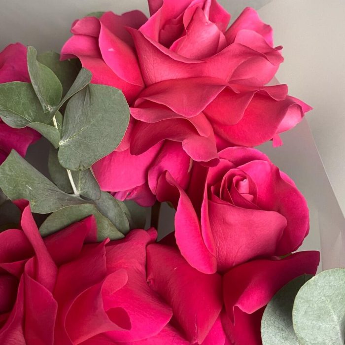Эвкалипт – 2 шт.Пионовидная роза – 5 шт.Упаковка дизайнерская – 1 шт.Открыточка с вашими пожеланиями – 1 шт.