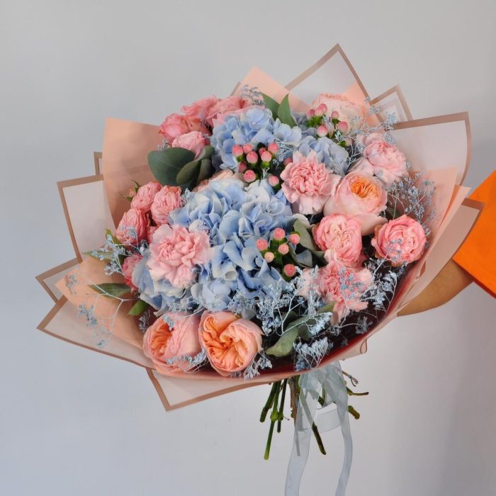Гиперикум – 3 шт.Гортензия – 2 шт.Роза кустовая – 5 шт.Эвкалипт – 5 шт.Лента атласная – 1 шт.Диантус – 4 шт.Упаковка дизайнерская – 2 шт.Роза пионовидная Джульетта – 5 шт.кермек голубой – 6 шт.хорошее настроение (в подарок) – 1 шт.
