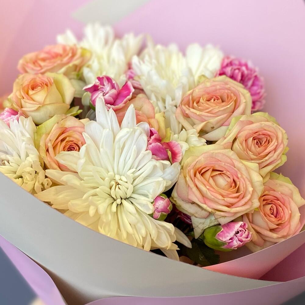Хризантема кустовая – 2 шт.Кустовая роза – 2 шт.Гвоздика кустовая – 4 шт.Упаковка дизайнерская – 1 шт.Лента атласная – 1 шт.