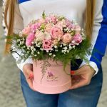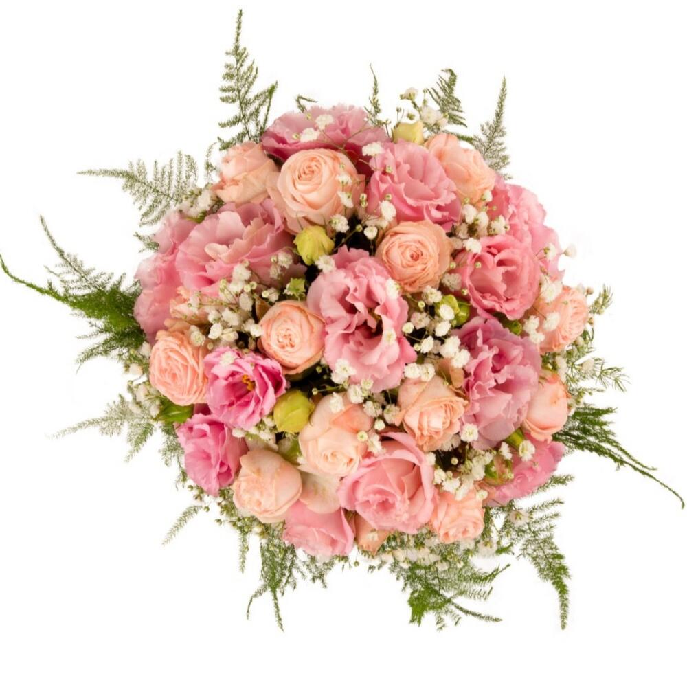 Цветы: кустовая роза, лизиантус, гипсофилия.