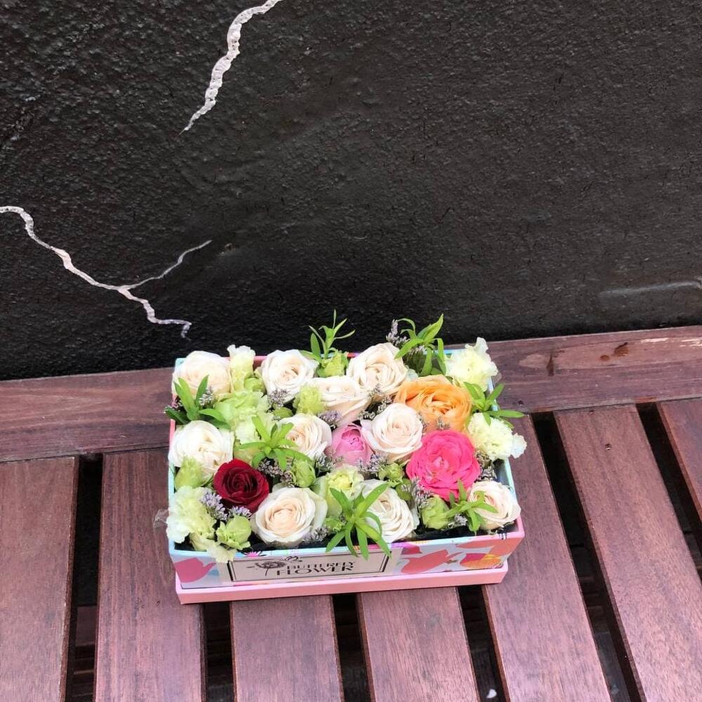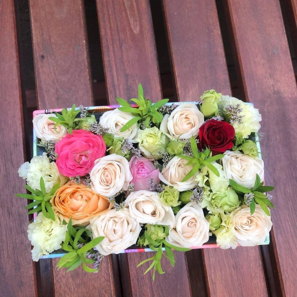 Роза – 3 шт.Роза кустовая – 3 шт.Эустома – 1 шт.декоративная зелень – 3 шт.Оазис – 1 шт.Коробка – 1 шт.